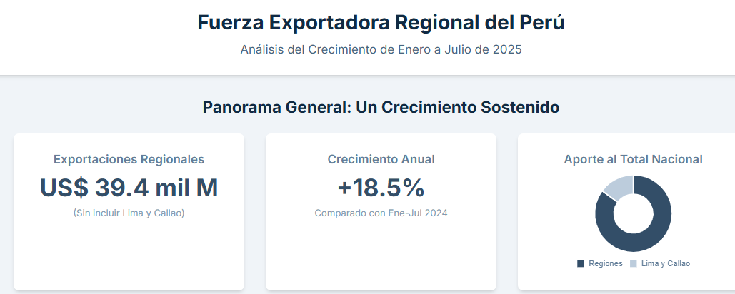 El Ministerio de Comercio Exterior y Turismo (Mincetur) anunció que las exportaciones regionales del Perú alcanzaron US$ 39 383 millones entre enero y julio de 2025, lo que significó un crecimiento de 18,5% frente al mismo periodo del año anterior, sin incluir Lima Metropolitana ni el Callao, concentrando el 85% del total nacional y consolidando a las regiones como verdaderos motores de la economía peruana.
