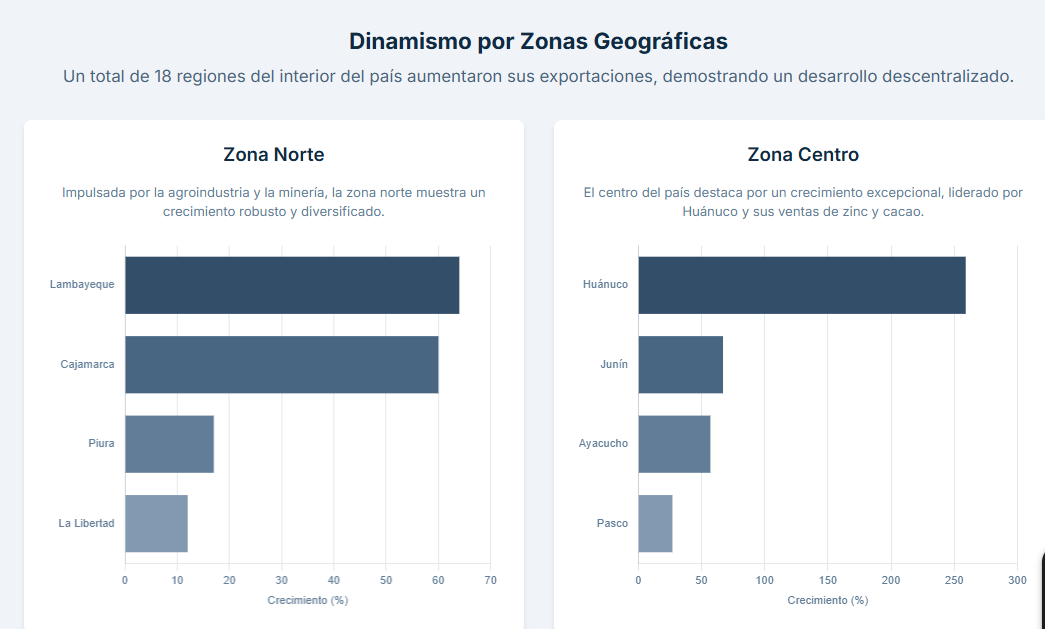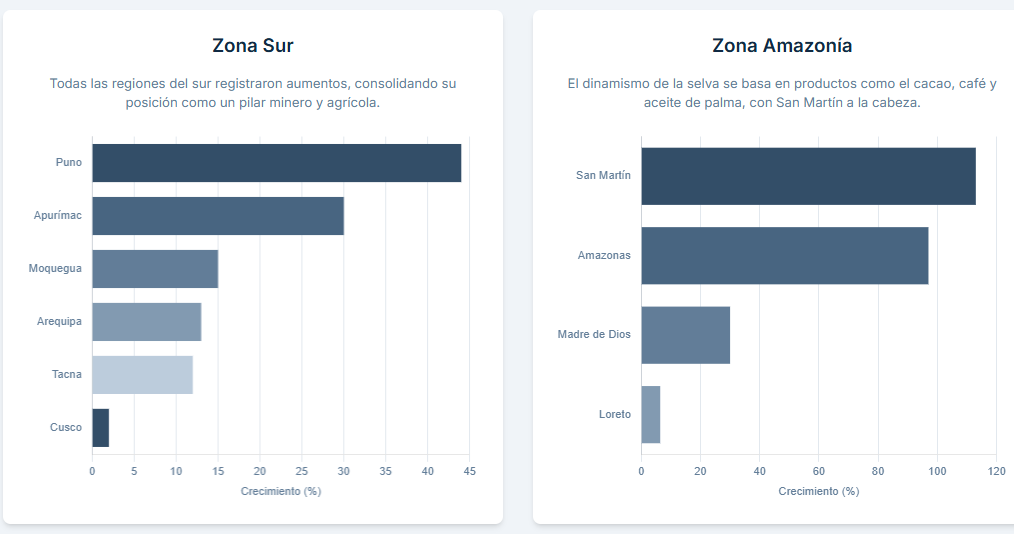 Todas las regiones del sur registraron aumentos: Puno (+44%), con oro, estaño y quinua; Apurímac (+30%), con cobre y quinua; Moquegua (+15%), por cobre, oro y harina de pescado; Arequipa (+13%), por oro, molibdeno y plata; Tacna (+12%), por cobre, aceituna y pota; y Cusco (+2%), por gas natural.