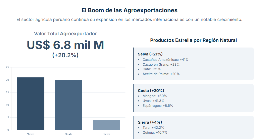 Por regiones naturales, la selva continuó liderando el crecimiento agroexportador con un alza de 21%, debido al incremento en exportaciones de café (+21%), cacao en grano (+23%), aceite de palma y derivados (+20%) y castañas amazónicas (+41%).