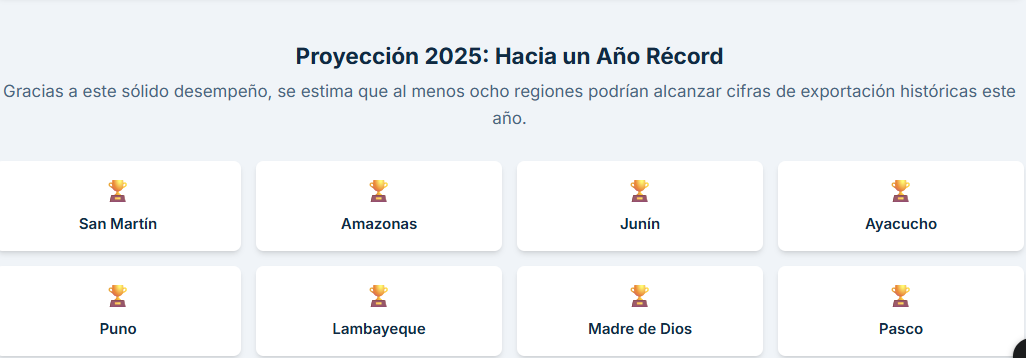 Con estas cifras, el Mincetur estima que al menos ocho regiones —San Martín, Amazonas, Junín, Ayacucho, Puno, Lambayeque, Madre de Dios y Pasco— podrían alcanzar exportaciones récord este 2025.