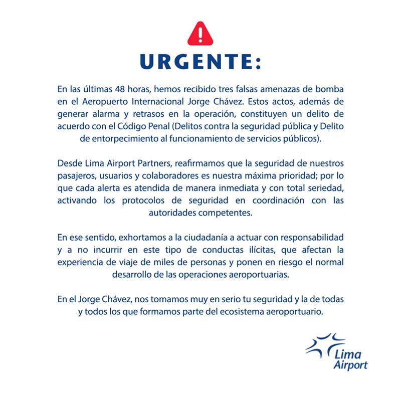 «Estos actos, además de generar alarma y retrasos en la operación, constituyen un delito de acuerdo con el Código Penal (Delitos contra la seguridad pública y Delito de entorpecimiento al funcionamiento de servicios públicos)», informó LAP en un comunicado.