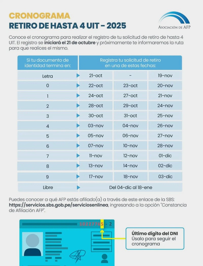 “Conoce el cronograma para realizar el registro de tu solicitud de retiro de hasta 4 UIT. El registro se iniciará el 21 de octubre y próximamente te informaremos la ruta para que realices el mismo”, detalla la Asociación de AFP en un comunicado.