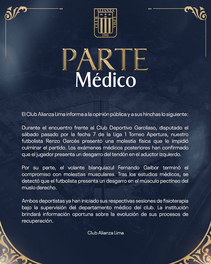 Los dos jugadores se lesionaron durante la séptima jornada, en el encuentro disputado frente a Real Garcilaso en la ciudad del Cusco. Aunque el club no precisó los días exactos de recuperación, confirmó que ambos iniciarán trabajos de rehabilitación con el equipo médico.