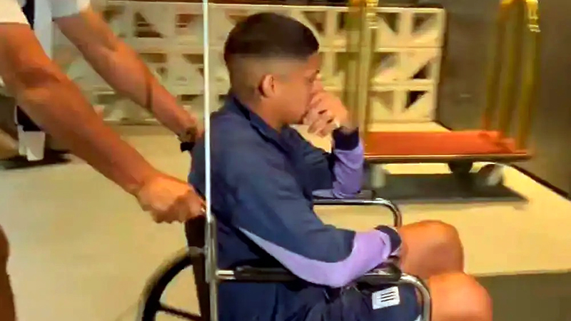 La calma previa al viaje se vio interrumpida a su llegada al aeropuerto de Lima, cuando se observó que uno de los jugadores del plantel estaba en silla de ruedas. Kevin Quevedo fue el protagonista de esta escena, aunque evitó dar declaraciones a los medios presentes.