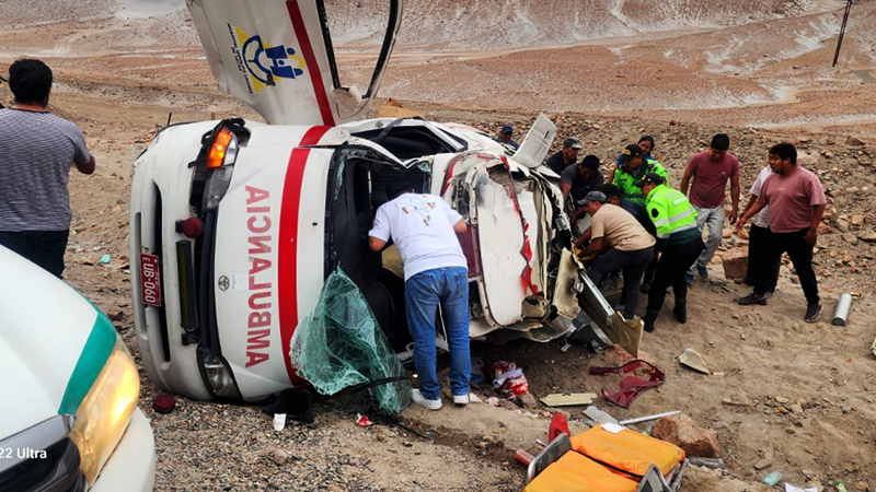 La ambulancia, con matrícula EUB-060, retornaba a Tacna después de trasladar un paciente a Arequipa. Por motivos que aún están bajo investigación, el vehículo se salió de la carretera y terminó volcado sobre su lado izquierdo en un área con terreno sin asfaltar junto a la vía.