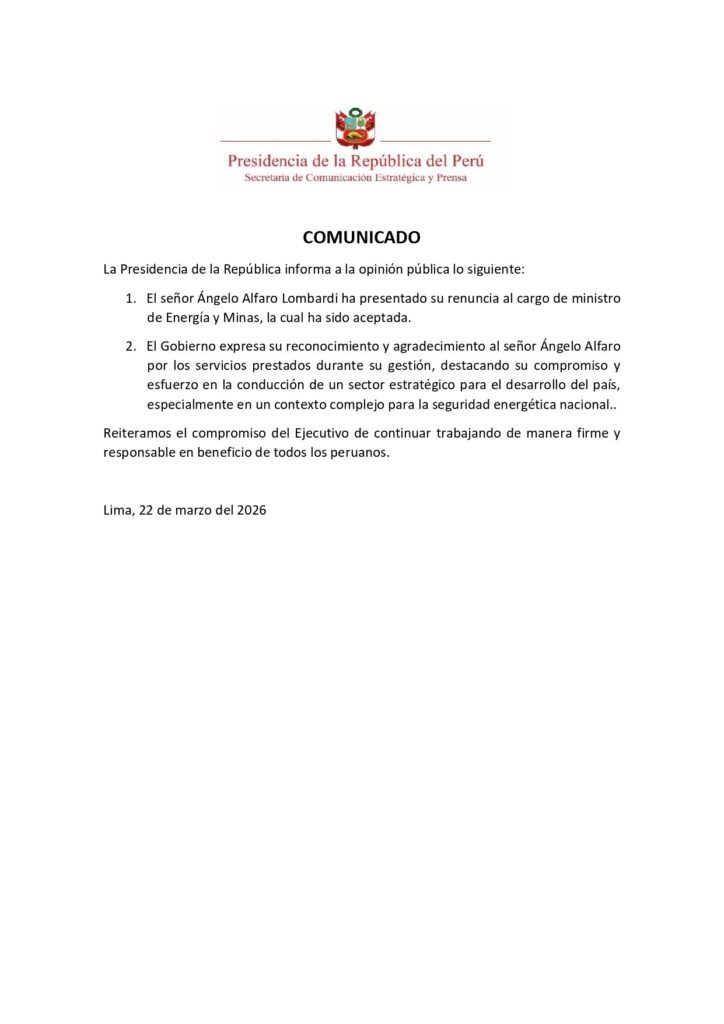 La Presidencia de la República del Perú emitió un pronunciamiento oficial la noche de este domingo informando que Ángelo Alfaro Lombardi decidió renunciar al cargo de ministro de Energía y Minas, determinación que ya cuenta con la aprobación del Poder Ejecutivo.