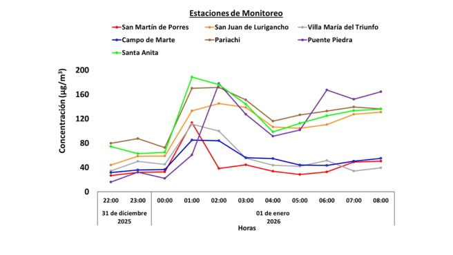 Las estaciones de la Red de Monitoreo Automático de la Calidad del Aire (REMCA) registraron concentraciones elevadas de contaminantes en diversos distritos de Lima Metropolitana, principalmente entre la 01:00 y las 08:00 horas del 1 de enero.