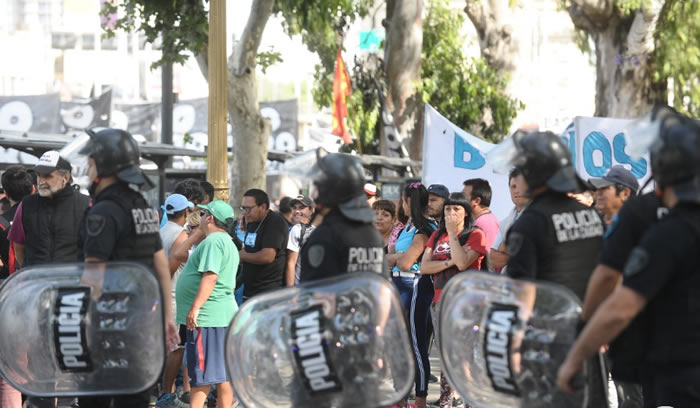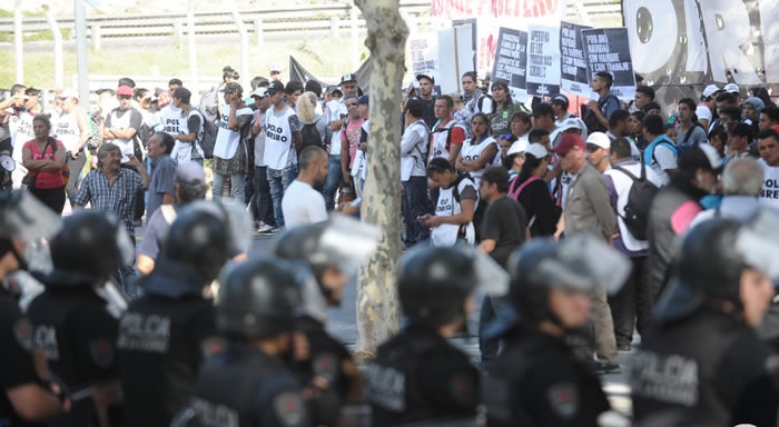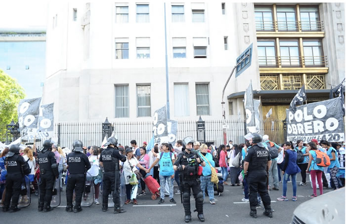 Desde las 3 de la tarde (hora local) la policía impide el avance de manifestantes del Polo Obrero, una parte de Barrios de Pie y otras organizaciones sociales para montar un acampe sobre la avenida 9 de Julio, frente al Ministerio de Desarrollo Social.