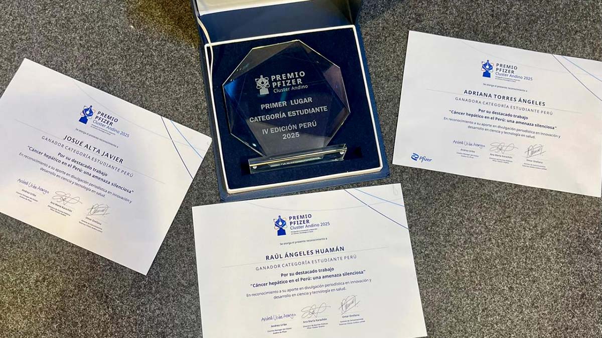 Finalmente, Adriana Torres, Daniel Alta y Raúl Ángeles fueron galardonados con el Premio Pfizer Clúster Andino 2025, en la categoría Estudiantes, gracias a su reportaje “Cáncer hepático en el Perú: una amenaza silenciosa”. Esta producción periodística destaca la problemática de la detección tardía y la falta de atención oportuna para esta enfermedad, un asunto que representa un grave desafío para el sistema de salud nacional y que ha recibido poca cobertura mediática.