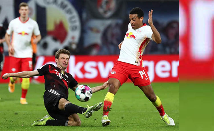 El Leipzig, hasta el gol de Goretzka, había mostrado agresividad y atrevimiento y había tenido clara ventaja en lo relativo a la posesión de la pelota, aunque no había generado llegadas claras al arco. El Bayern dispuso de un buen contragolpe en el minuto 22, el que terminó con un remate desviado de Choupo Moting.