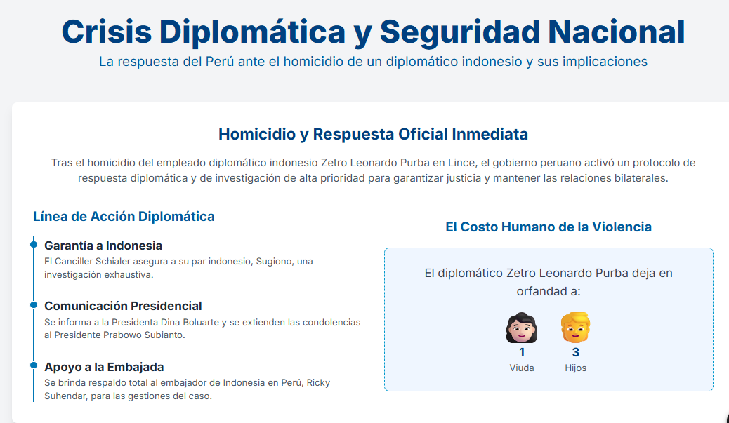 Adicionalmente, subrayó que están brindando todo el respaldo necesario al representante diplomático de Indonesia en Perú, Ricky Suhendar, para las gestiones relacionadas con el caso.