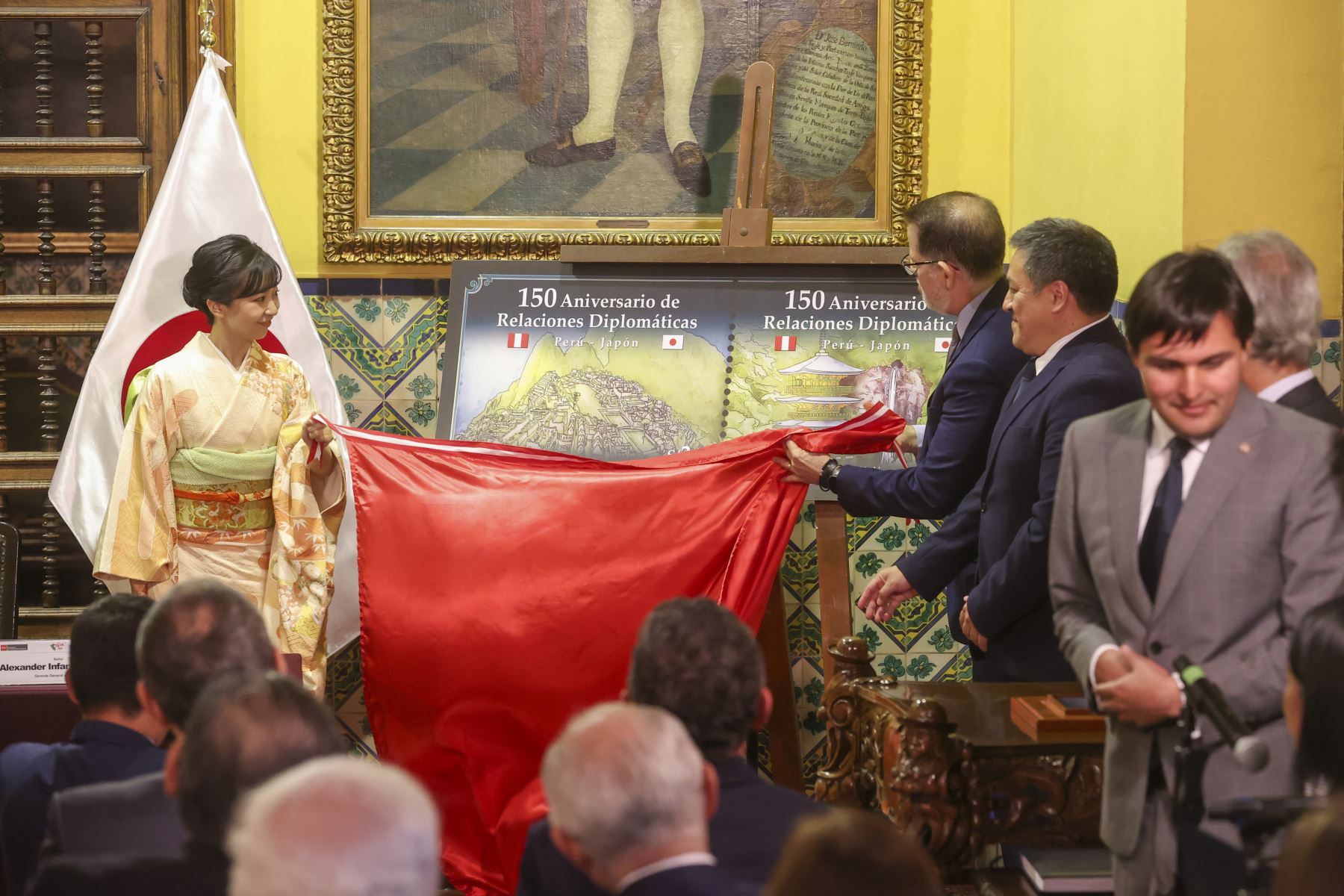 Durante la ceremonia, el vicecanciller, la princesa Kako y el gerente general de Serpost, Alexander Infantes, presentaron el sello postal conmemorativo por el 150 aniversario del establecimiento de relaciones diplomáticas. Dicha estampilla circulará a nivel nacional e internacional.