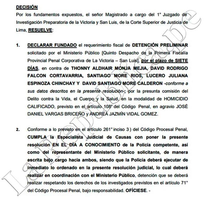 Además de Rodrigo Falcón, el Poder Judicial ordenó la detención preliminar de Thonny Monja Mejía, conductor del auto que seguía al taxi; Lucero Espinoza, quien aparece como copiloto en dicho vehículo; David More Calderón, relacionado con el trámite del duplicado de la placa del automotor; y David More Ríos, señalado por su supuesta participación en el mismo procedimiento. Los implicados permanecerán detenidos durante siete días debido a su presunta vinculación con el delito de homicidio calificado.