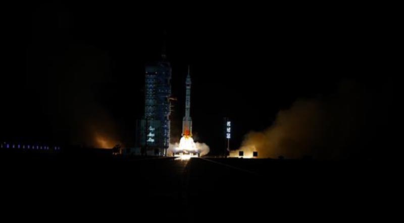 Base de lanzamiento de Jiuquan (China).- A la hora prevista, las 00.23 de hoy, hora local (16.23 GMT de este viernes), despegó desde Jiuquan, en el norte de China, el cohete Larga Marcha 2F que transportaba la nave Shenzhou-13 con tres astronautas a bordo, constató Efe.