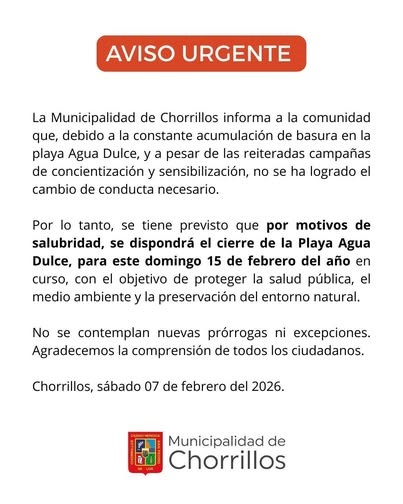 «Se tiene previsto que, por motivos de salubridad, se dispondrá el cierre de la playa Agua Dulce, para este domingo 15 de febrero del año en curso, con el objeto de proteger la salud pública, el medio ambiente y la preservación del entorno natural», remarcó la institución.