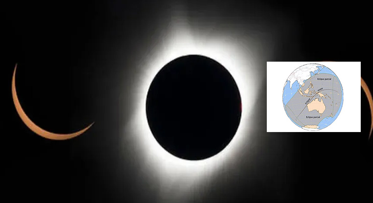 El máximo del eclipse mixto se dará a las 4 horas y 17 minutos al sudeste de Timor Oriental. La magnitud máxima será 1,01 y su duración máxima 1 minuto 16 segundos.
