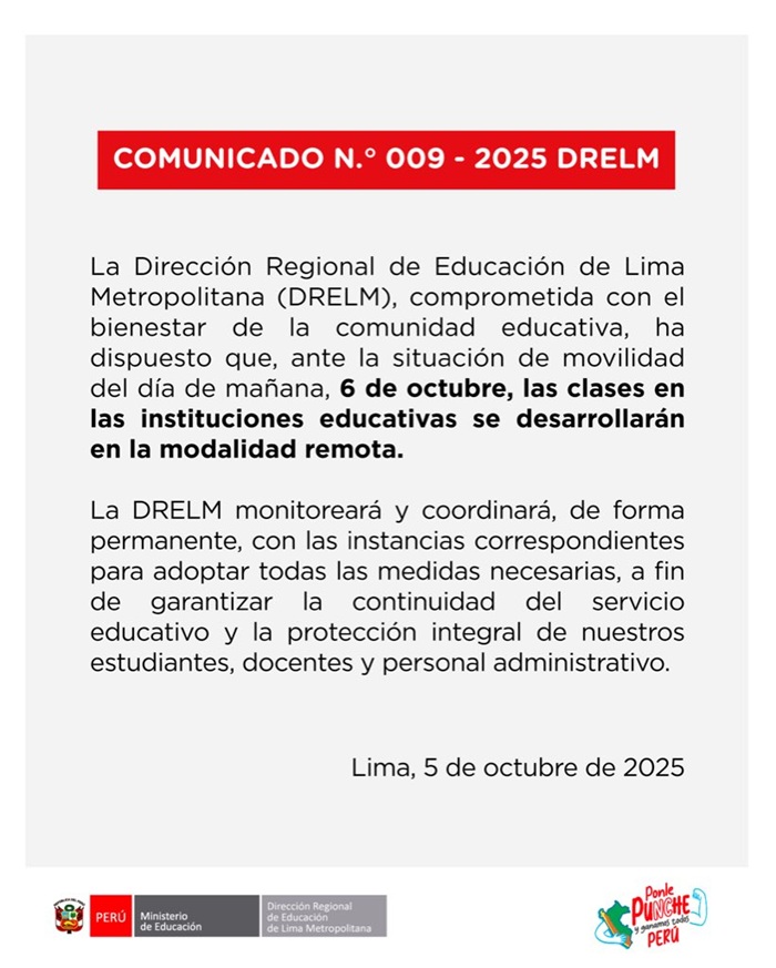 «La Dirección Regional de Educación de Lima Metropolitana (DRELM), comprometida con el bienestar de la comunidad educativa, ha dispuesto que, ante la situación de movilidad del día de mañana, 6 de octubre, las clases en las instituciones educativas se desarrollarán en la modalidad remota», subrayaron en un comunicado.