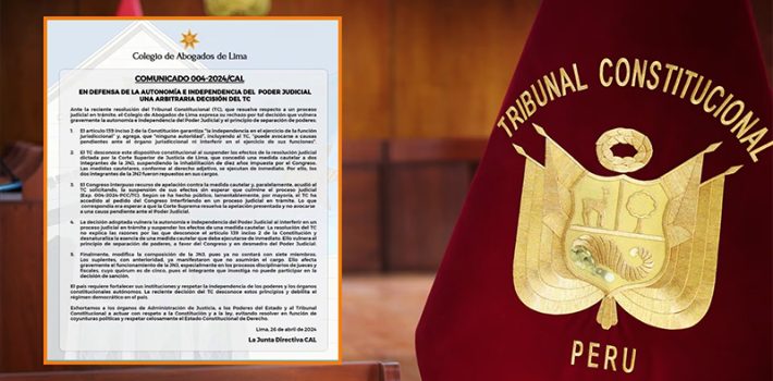 El Colegio de Abogados de Lima señaló que la decisión del Tribunal Constitucional (TC), que ordenó suspender los efectos de la resolución judicial que restituyó a Inés Tello y Aldo Vásquez como miembros titulares de la Junta Nacional de Justicia (JNJ), vulnera la autonomía e independencia del Poder Judicial (PJ). Así lo manifestó a través … Sigue leyendo Colegio de Abogados rechaza decisión del TC que vulnera autonomía del Poder Judicial