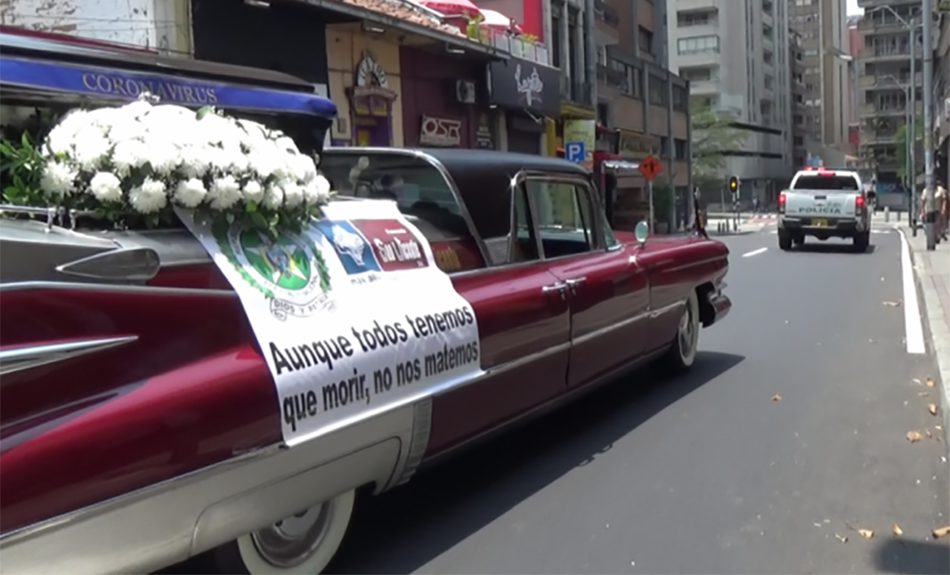 La iniciativa, liderada por la Policía Metropolitana de Medellín, donde hay 43 casos confirmados, hace parte de la campaña «Aunque todos tenemos que morir, no nos matemos», mensaje que porta el coche que ha sido decorado con flores blancas y que transporta un cofre con una cinta con el nombre «coronavirus».