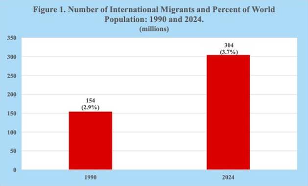 En 2024, había aproximadamente 304 millones de migrantes internacionales en todo el mundo, lo que representaba aproximadamente 3,7 % de la población mundial de 8200 millones de personas. Esta cifra casi duplica la cantidad de migrantes internacionales en 1990, que era de aproximadamente 154 millones, lo que representaba 2,9 % de la población mundial de 5300 millones de personas en ese momento (Imagen 1).