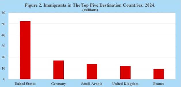 Los cinco principales países de destino de la migración y su porcentaje sobre el total de migrantes son Estados Unidos (17 %), Alemania (6 %), Arabia Saudí (5 %), el Reino Unido (4 %) y Francia (3 %) (Imagen 2).