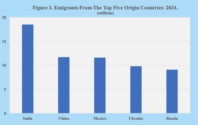 En contraste, los cinco principales países de emigración y su porcentaje sobre el total de emigrantes son India (6 %), China (4 %), México (4 %), Ucrania (3 %) y Rusia (3 %) (Imagen 3).