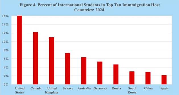Entre 2024 y 2025, había aproximadamente siete millones de estudiantes internacionales en todo el mundo. Los principales destinos de estos estudiantes internacionales fueron Estados Unidos (17 %), Canadá (12 %), Reino Unido (11 %), Francia (7 %) y Australia (6 %). Otros países de destino importantes fueron Alemania, Rusia, Corea del Sur, China y España (Imagen 4).