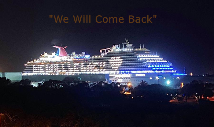 Cada noche los barcos de Carnival amarrados en puertos de Estados Unidos y Australia y los que estén anclados en el mar a una distancia visible desde tierra servirán de pantalla para unos juegos de luces, entre los cuales está el que muestra las palabras «We Will Come Back» (Volveremos).