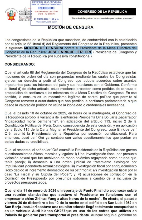 Legisladores de varios grupos parlamentarios formalizaron este martes la presentación de dos solicitudes de censura contra José Jerí, quien ocupa simultáneamente la presidencia del Congreso y la jefatura del Estado por sucesión constitucional, con el objetivo de removerlo de su cargo al frente del Parlamento.