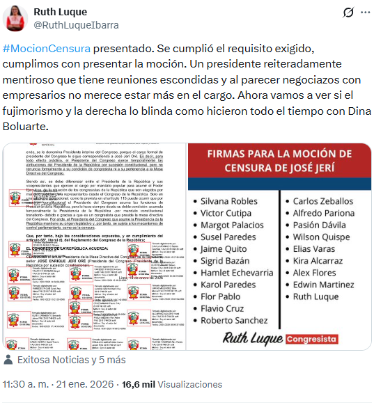 «Se cumplió el requisito exigido, cumplimos con presentar la moción. Un presidente reiteradamente mentiroso que tiene reuniones escondidas y al parecer negociazos con empresarios no merece estar más en el cargo. Ahora vamos a ver si el fujimorismo y la derecha lo blinda como hicieron todo el tiempo con Dina Boluarte», señaló Ruth Luque, del Bloque Democrático Popular, en su cuenta de X.
