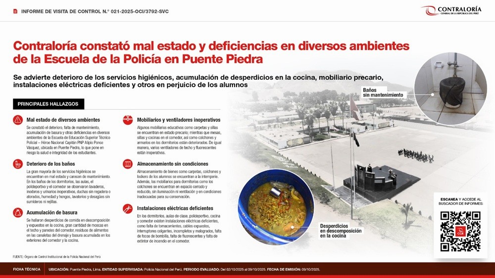En el Informe de Visita de Control 021-2025-OCI/3792-SVC, que comprendió el periodo del 2 al 9 de octubre de 2025, se señala que una comisión de control se constituyó en el mencionado recinto policial los días 6 y 7 de octubre últimos y advirtió que la gran mayoría de los servicios higiénicos se encuentran en mal estado y carecen de mantenimiento, lo que pone en riesgo la salud de los alumnos y afecta la operatividad de la infraestructura.