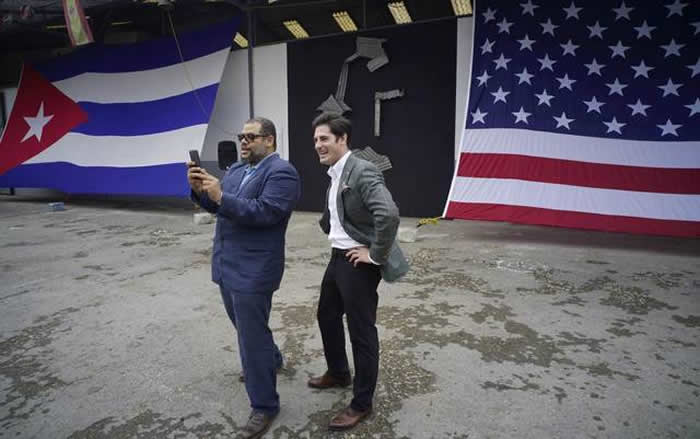 Brett Perlmutter (derecha), jefe de operaciones de Google en Cuba, y Alexis Leiva Machado, el escultor cubano conocido como Kcho, se toman un selfie a la entrada de un nuevo centro tecnológico del gigante informático estadounidense en La Habana.