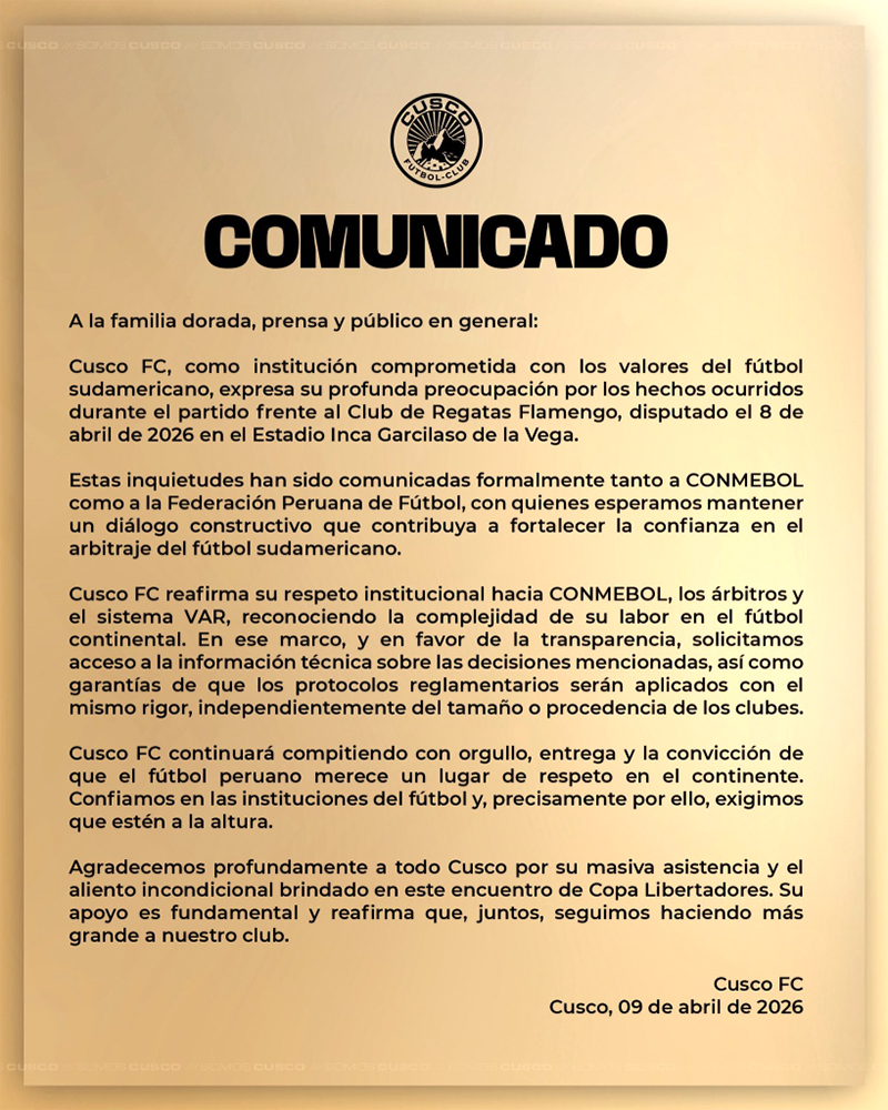 La reacción del cuadro cusqueño no se hizo esperar. A través de un comunicado publicado en sus redes sociales, anunciaron la presentación de una queja formal ante la Confederación Sudamericana de Fútbol (Conmebol) y la Federación Peruana de Fútbol (FPF), señalando directamente al arbitraje del paraguayo Derlis López como motivo de su preocupación.