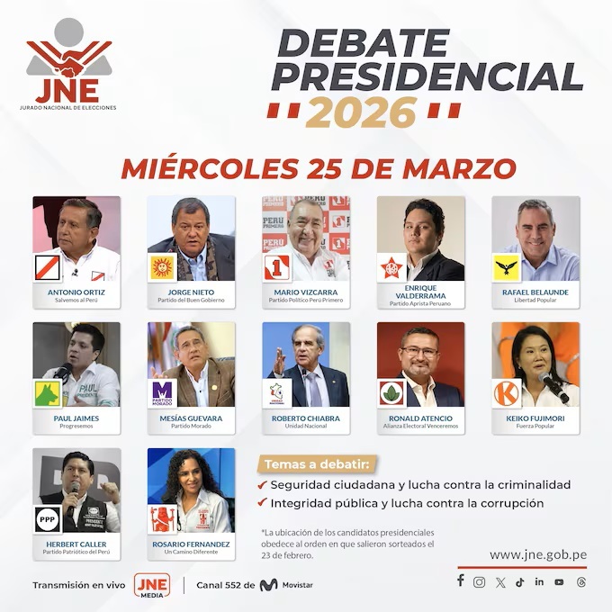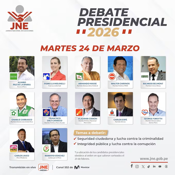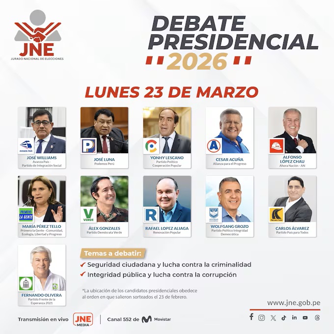 El proceso para las elecciones 2026 alcanza su fase determinante con los encuentros organizados por el Jurado Nacional de Elecciones (JNE), que arrancan este lunes 23 de marzo. En este espacio, quienes aspiran a la presidencia presentarán y discutirán sus planes de gobierno frente a los votantes, quienes acudirán a las urnas el domingo 12 de abril.