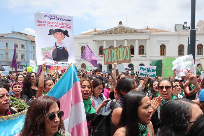 «Las niñas son niñas, las niñas no son madres», fueron algunas de las consignas coreadas por las activistas que se congregaron en la Plaza del Teatro, en el casco colonial de Quito.