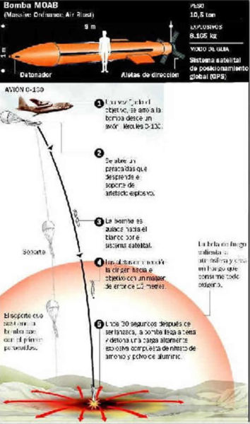 Se trata del GBU-43/B Massive Ordnance Air Blast Bomb (MOAB), uno de los secretos mejor guardados en la industria militar hasta su detonación registradas el jueves por la tarde (hora local), cuyas principales cualidades no solo figura su gran potencia sino una trayectoria de alta precisión que lo convierte el ideal para las operaciones antiterroristas “quirúrgicas” a lugares ubicados cerca de las áreas urbanas.