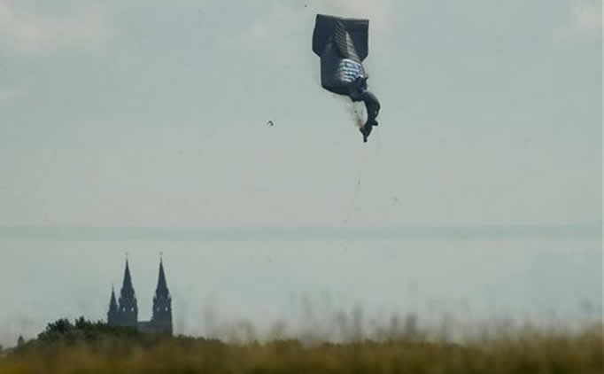 Aparentemente el dirigible con la publicidad de PenFed se desinfló, estalló en llamas y se estrelló al promediar las 11 de lamañana cerca de la autopista 83 y la autopista 167 de Wisconsin.