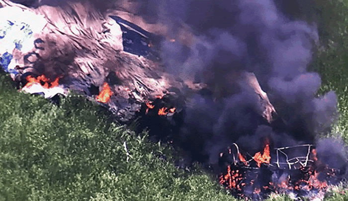 Un video filmado por un helicóptero para un canal de televisión muestra pedazos aplanados del aparato junto con metales y pasto quemados. (ECHA-Agencias)