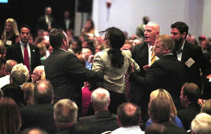 Ocasionalmente, los actos de campaña multitudinarios de Trump, a los que pueden ingresar miembros del público, son interrumpidos por manifestantes pero es la primera ocasión que enfrenta tal resistencia sostenida durante un discurso de política ante un grupo privado.