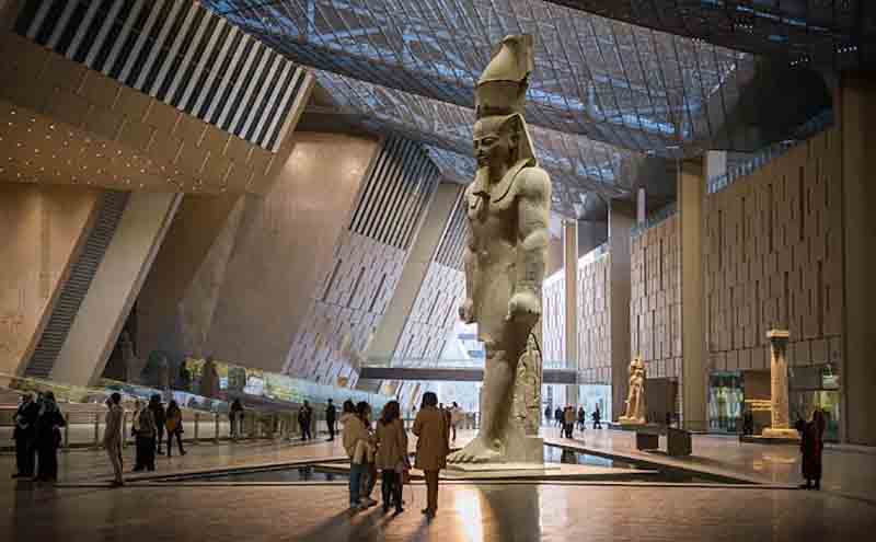 En el gran atrio, de siete mil metros cuadrados, una estatua de 11 metros de altura de Ramsés II, el faraón más emblemático del Antiguo Egipto, recibe a los visitantes, según constató Prensa Latina durante un recorrido por la instalación.