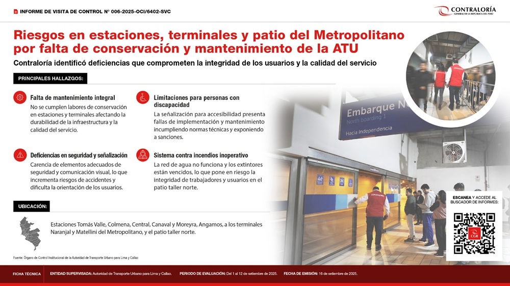 La Contraloría General de la República alertó deficiencias en la conservación y mantenimiento de la infraestructura, señalización, accesibilidad y sistemas contra incendios de las estaciones, terminales y del patio taller norte del Corredor Segregado de Alta Capacidad (COSAC I), conocido como Metropolitano, a cargo de la Autoridad de Transporte Urbano para Lima y Callao (ATU). Estas situaciones ponen en riesgo la calidad del servicio y la seguridad de los usuarios.