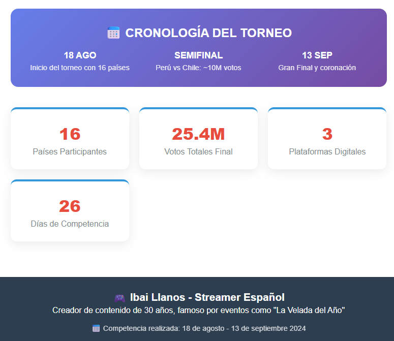 El influencer ibérico anunció la victoria nacional el 13 de septiembre mediante sus canales oficiales de TikTok, Instagram y YouTube, tras una final disputada frente a Venezuela, país que también accedió a la definición con una impresionante movilización de votantes en las tres plataformas digitales.