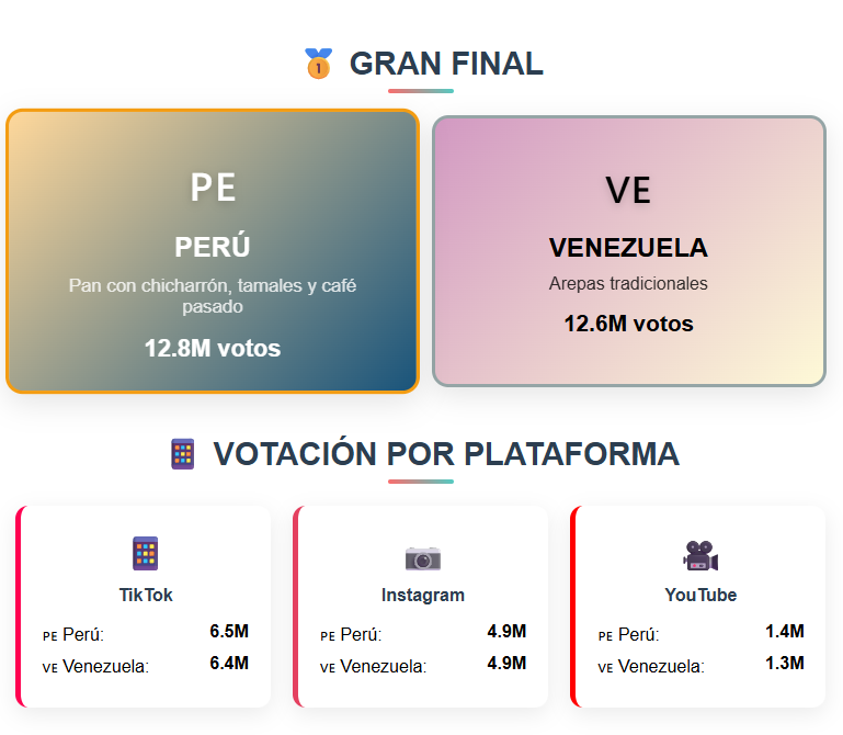La nación sudamericana dominó toda la competencia, no únicamente por conseguir marcas históricas, como los casi 10 millones de votos en la semifinal ante la marraqueta chilena, sino por la extraordinaria movilización de usuarios digitales que inundaron las redes sociales de Ibai para defender al desayuno peruano como el superior.
