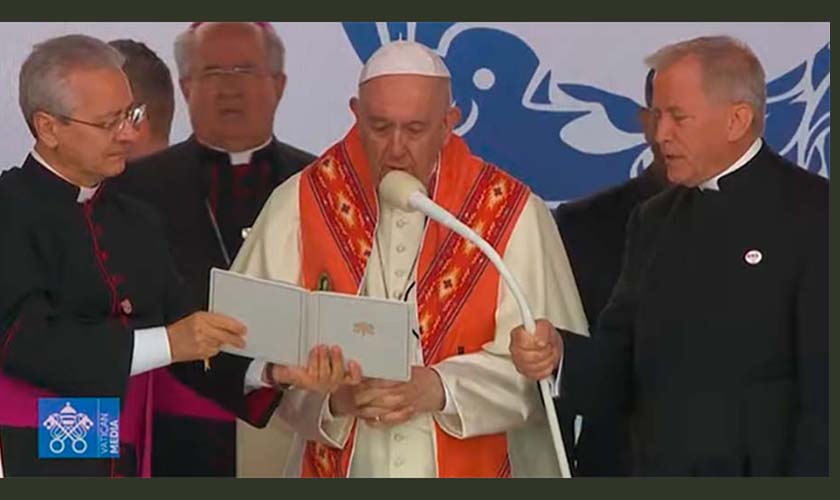 El Papa ha dejado claro el motivo de su visita que, a pesar del dolor que arrastra en la rodilla derecha y que le obliga a desplazarse en silla de ruedas, no ha cancelado: «Estoy en tierras nativas para decirles personalmente que estoy dolido, para implorar a Dios el perdón, la sanación y la reconciliación, para manifestarles mi cercanía, para rezar con ustedes y por ustedes».