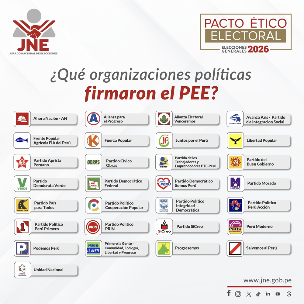 El Pacto Ético Electoral, promovido por el Jurado Nacional de Elecciones (JNE), firmaron hoy jueves de forma voluntaria la mayoría de las agrupaciones políticas que competirán en los comicios de abril del 2026.