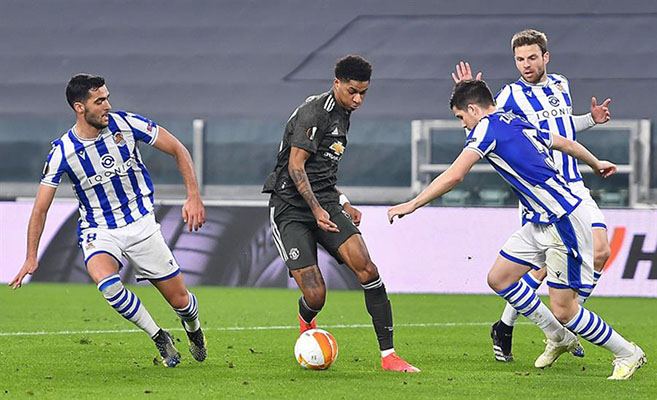 Enseguida llegaría el tercer mazazo, con un golazo de Rashford ante una defensa de la Real muy errática que lastraba cualquier opción de mantener viva la eliminatoria y que encajaría todavía el cuarto tanto, conquistado por Daniel James.
