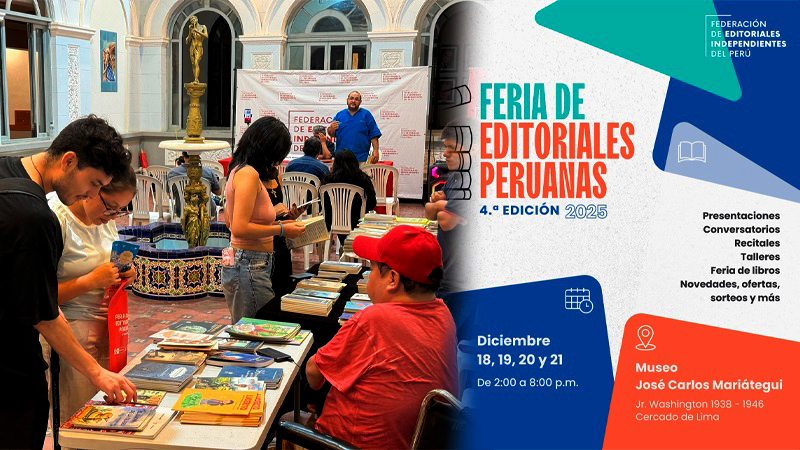 El MJCM y la Federación de Editoriales Independientes del Perú, anuncian con entusiasmo la 𝗙𝗲𝗿𝗶𝗮 𝗱𝗲 𝗘𝗱𝗶𝘁𝗼𝗿𝗶𝗮𝗹𝗲𝘀 𝗣𝗲𝗿𝘂𝗮𝗻𝗮𝘀 – 4.ª 𝗲𝗱𝗶𝗰𝗶𝗼́𝗻 𝟮𝟬𝟮𝟱, que se realizará del 18 al 21 de dic… pic.twitter.com/Dcl2PFlMH6— Museo José Carlos Mariátegui (@MuseoMariategui) November 17, 2025