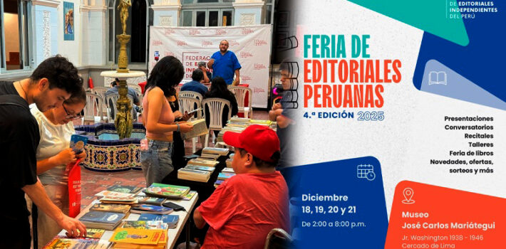 La Federación de Editoriales Independientes del Perú (FEIP), en alianza con el Museo José Carlos Mariátegui, invita a la cuarta edición de la Feria de Editoriales Peruanas 2025, que se desarrollará del 18 al 21 de diciembre, en horario de 2:00 p. m. a 8:00 p. m., en la emblemática Casa Museo Mariátegui, ubicada en … Sigue leyendo Feria de Editoriales Peruanas celebra su cuarta edición en la Casa Museo Mariátegui