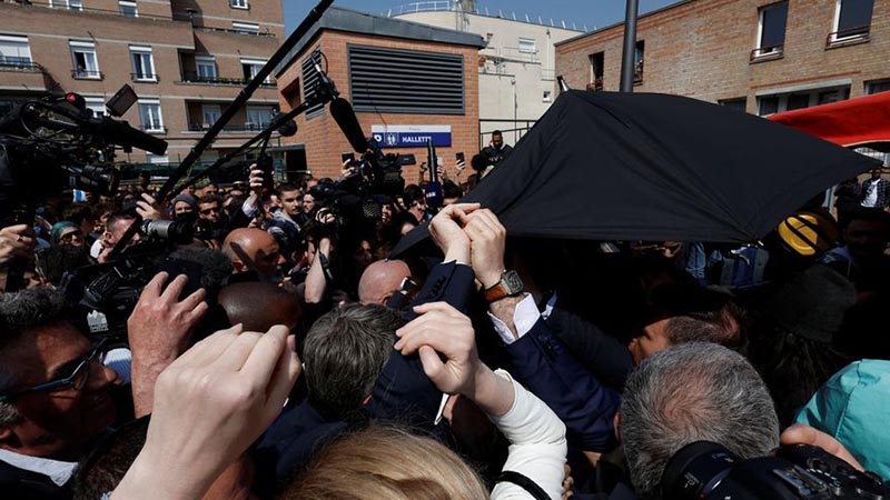 MADRID.- El presidente de Francia, Emmanuel Macron, ha sido atacado con tomates durante visita a un mercado de la localidad de Cergy, donde ha defendido que tendrá en cuenta los intereses de las clases más desfavorecidas en su nuevo mandato.