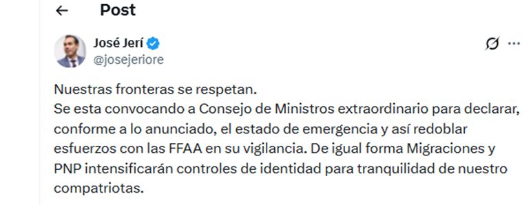 Hoy, Luis Ramón Torres, gobernador regional de Tacna, remitió un oficio formal dirigido a José Jerí solicitando que se decrete el estado de emergencia en las zonas limítrofes de las provincias de Tacna y Tarata, a consecuencia de la agudización de la crisis migratoria con el vecino país de Chile.